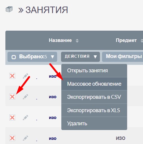 Зайдите в модуль Обучение/Занятия, отфильтруйте занятия, в которых нужно сменить преподавателя. Выберите все занятия галочкой (Выбрано/Все записи). Нажмите Действия/Массовое обновление.
