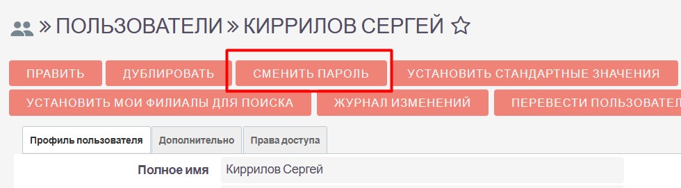 Если включено автоматическое создание паролей – в карточке пользователя будет сверху кнопка «Сменить пароль». Если нажать эту кнопку пользователю будет выслано письмо с готовым новым паролем на почту. Его пароль в системе поменяется.