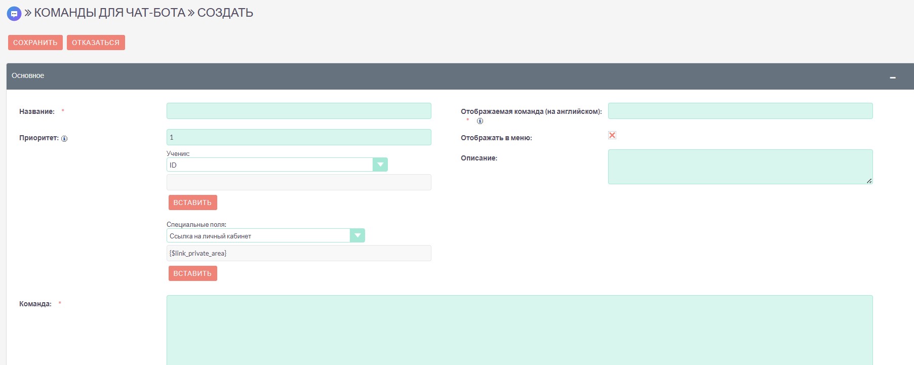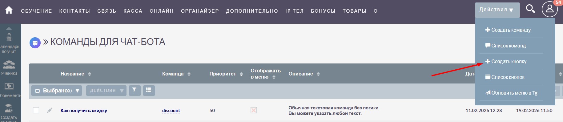 Зайдите в Администрирование - Команды для чат-бота – кнопка Действия (сверху /справа) - Создать команду.