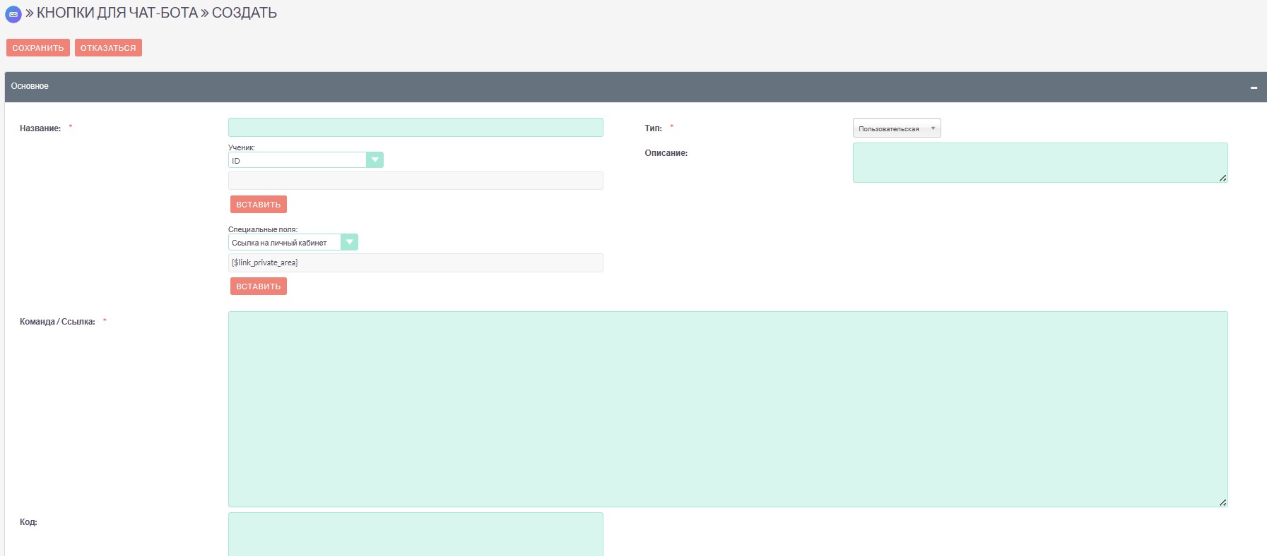 Команда/Ссылка – заполните с помощью специальных программных тегов или текста – ту информацию, которая будет выводиться, при нажатии на кнопку, если тип – ссылка, нужно запрограммировать ссылку, например, на пополнение баланса.