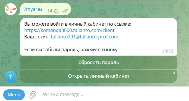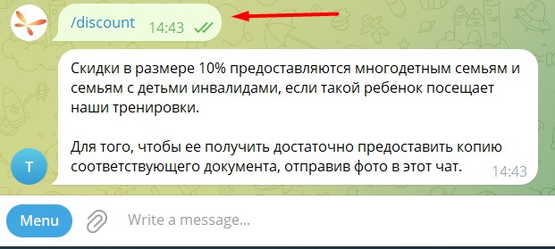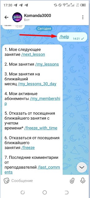 Команда - можно нажать на название команды в "Меню" или напечатать ее в строке ввода. Чат бот выполнит команду.
