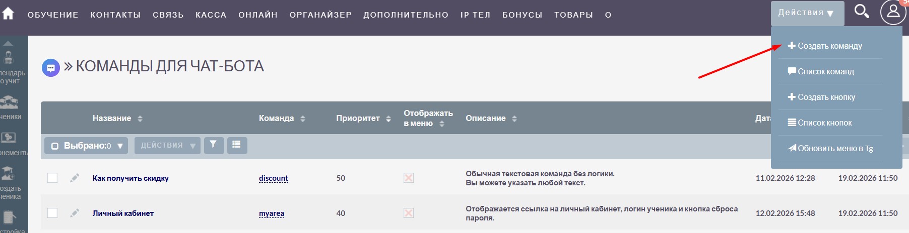 Учебный центр может использовать уже готовые команды для настройки бота, или создать свои собственные.