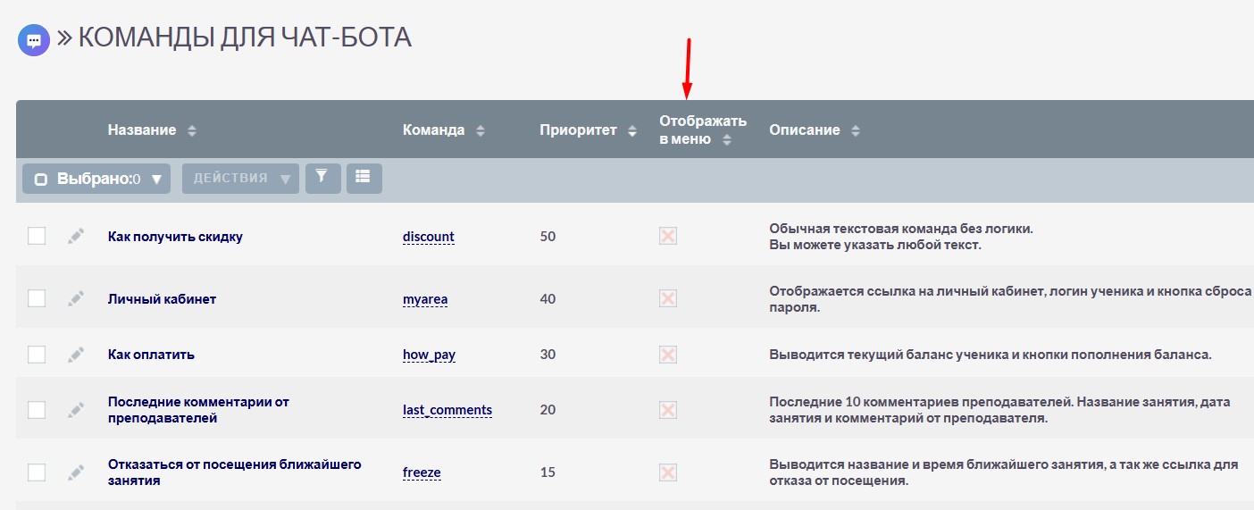 Выберите команды, которые вы хотите сделать доступными для вашего бота, и установите галочку Отображать в меню. Это можно сделать массовым обновлением.