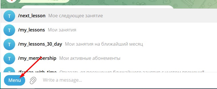 Меню(команд) – Если открыть чат с ботом в Телеграме присутствует кнопка "Меню" при нажатии на которую выпадает список доступных команд.