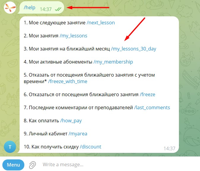 Либо можно напечатать /help или /menu – тогда выпадет список команд и их описание. Работает для Телеграма и для Макса.