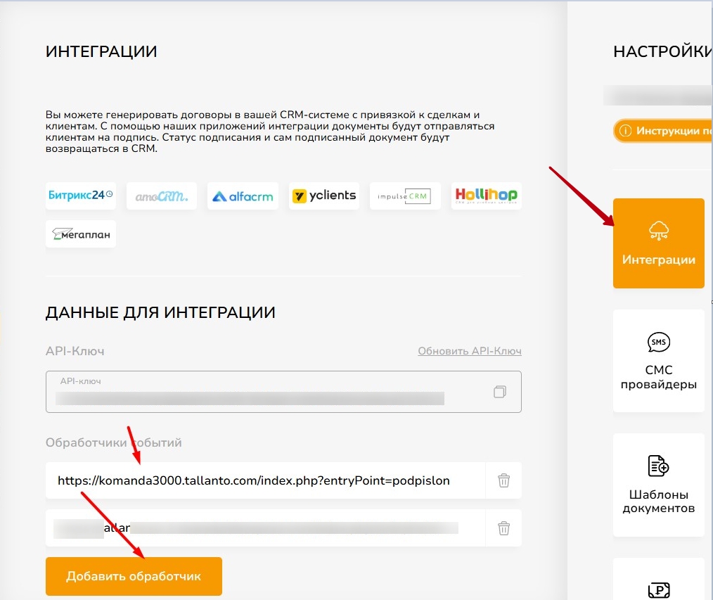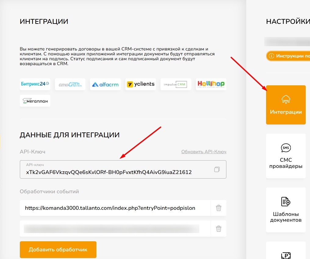Выберите "Интеграции", нажмите "Добавить обработчик" и скопируйте туда адрес веб-хука из Талланто.