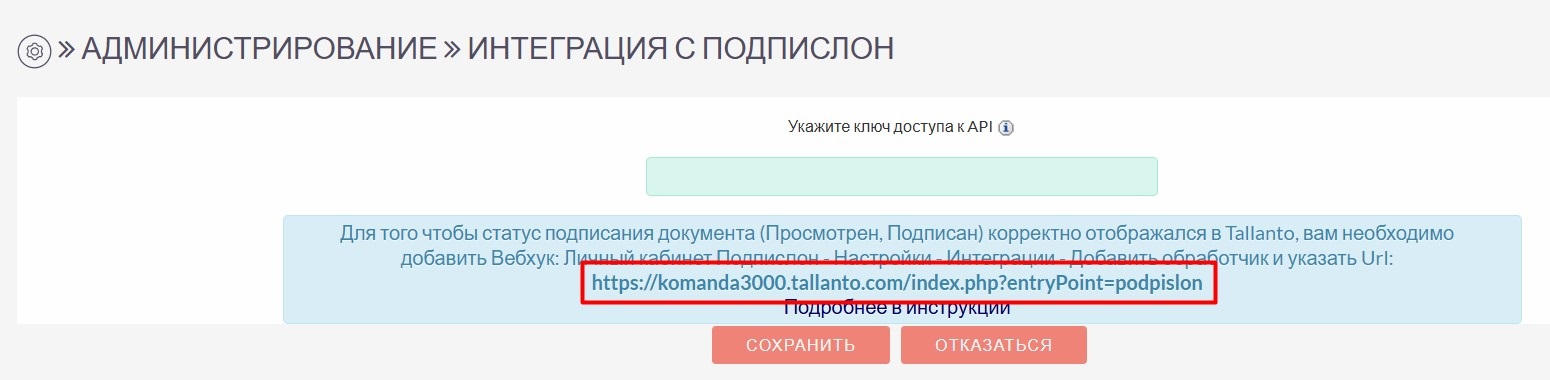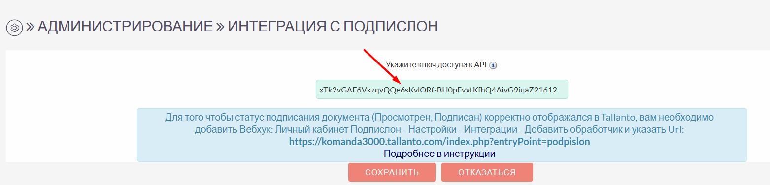 Вернитесь в Талланто, Администрирование - Интеграция с ЭДО Подпислон - и внесите ключ для доступа к API в настройку. Сохраните.