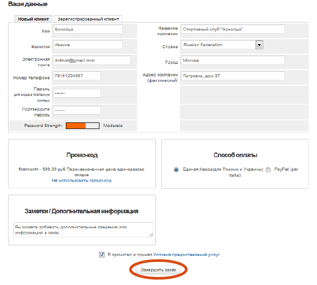 Поставьте галочку, подтверждающую, что вы прочли и приняли условия предоставления услуг » Завершить заказ.