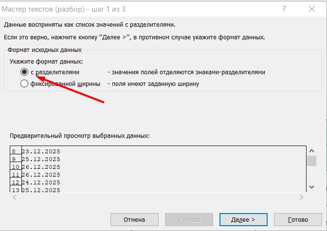 Всплывет окошко. Здесь укажите формат данных: С разделителями. Нажмите Далее
