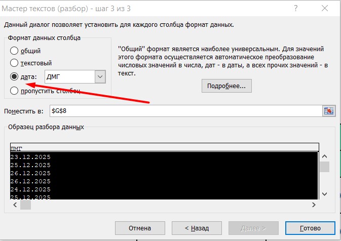 Выберите формат данных столбца = Дата (ДМГ). Нажмите Готово