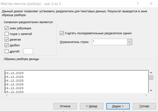 Укажите символы разделители – знак табуляции, запятая, пробел, нажмите Далее