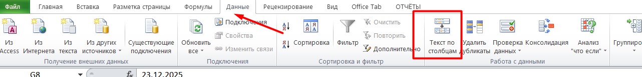 Перейдите сверху на вкладку «Данные» нажмите «Текст по столбцам».