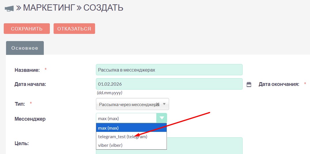 Указываем Тип маркетинговой кампании Рассылка через мессенджер. Выбираем нужный мессенджер и нажимаем "Cохранить".