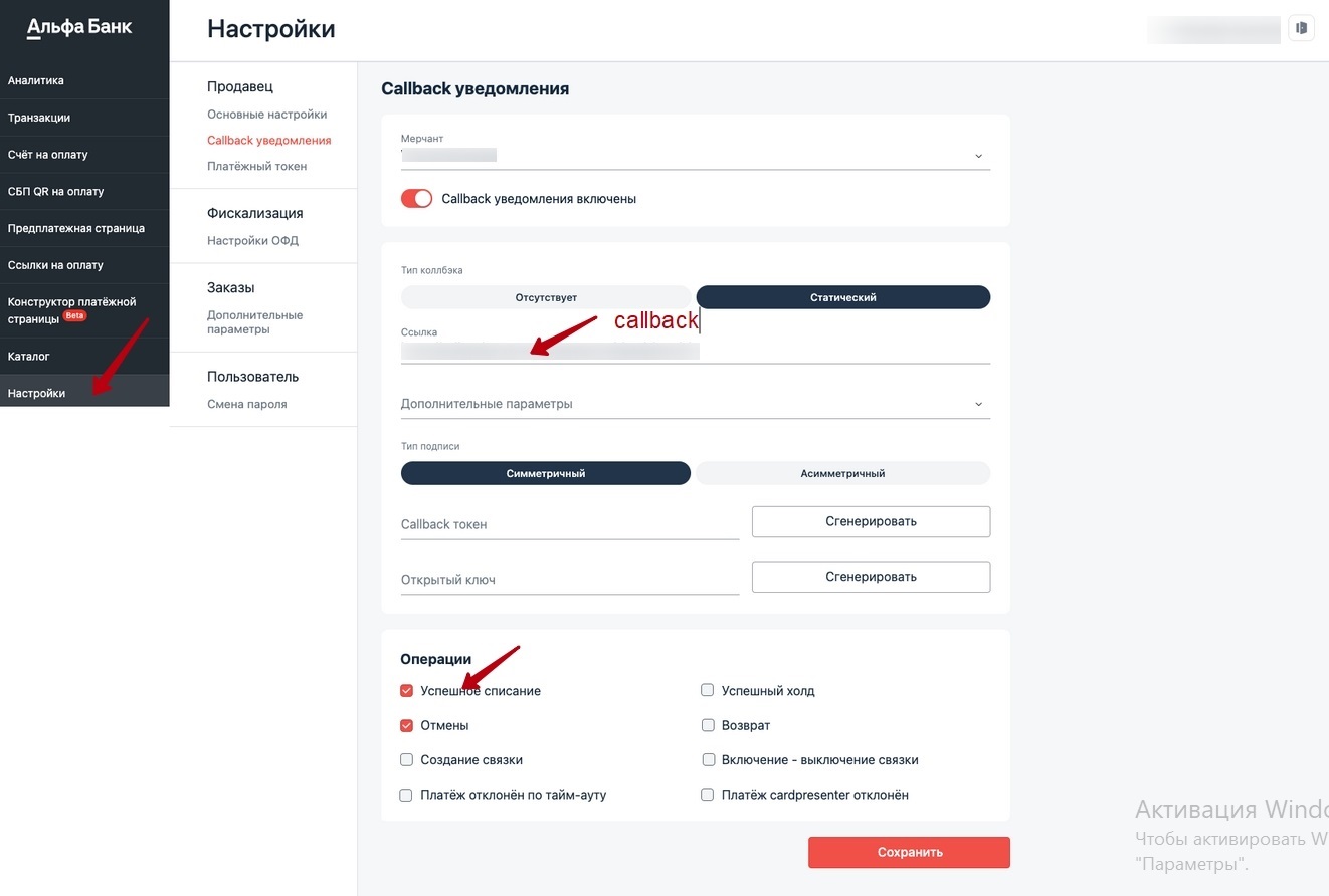 Войдите в личный кабинет Альфа-банка, в раздел Настройки - Продавец - Callback уведомления. В поле Ссылка введите значение из Талланто, установите галочки Успешное списание и Отмены, как показано на картинке. Нажмите Сохранить.