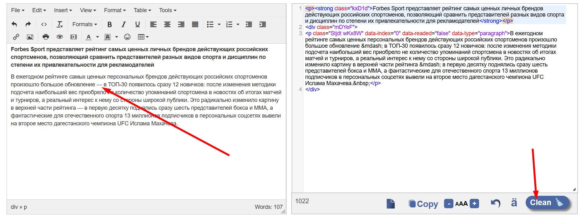 Далее слева нажмите "Clean". После того как html текст обработан - скорируйте в буфер обмена результат ("Copy").