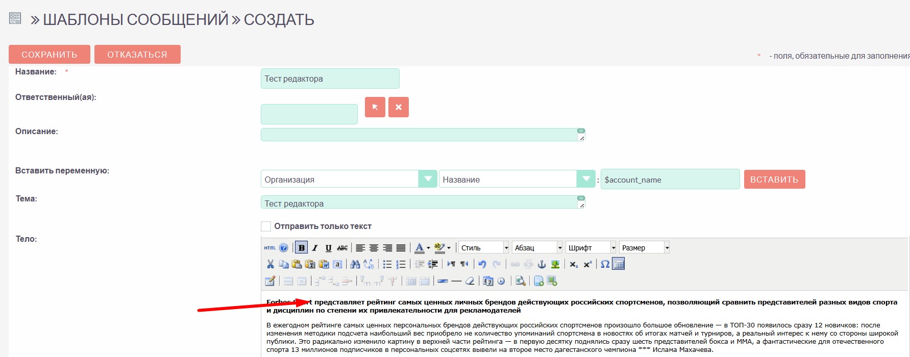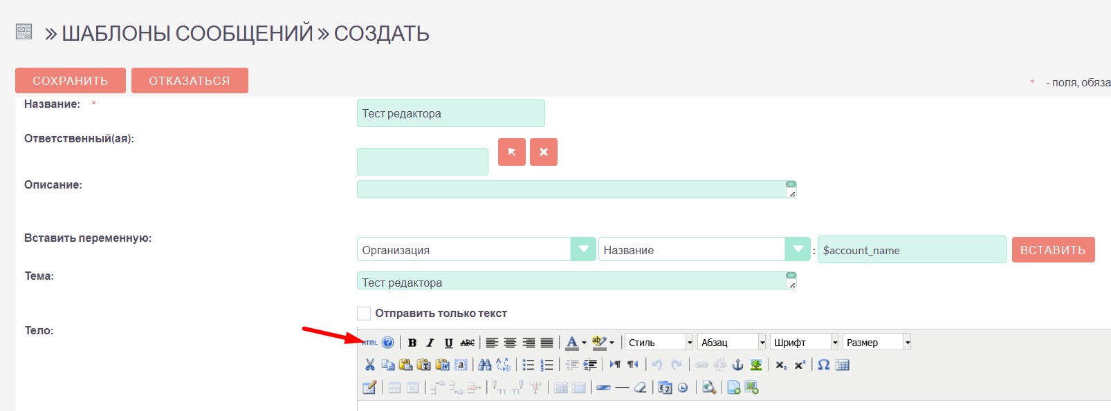 В появившейся форме заполните название шаблона, тему и текст письма (верстается с помощью визуального редактора). Выберите ответственного, нажав на стрелку.