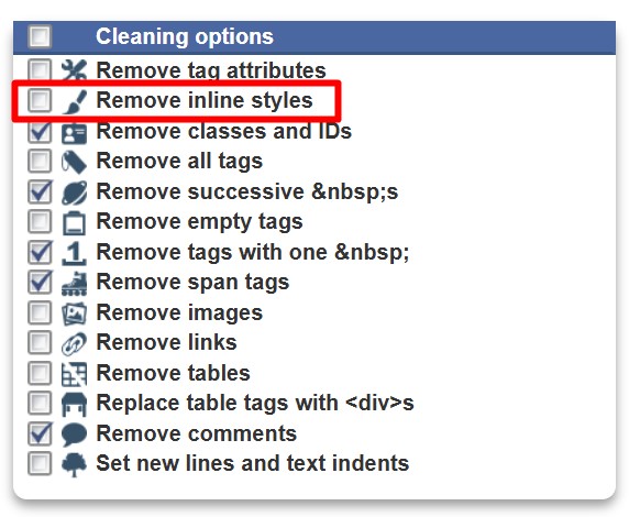 Если вы копируете объемный текст с большим количеством форматирования используйте инструмент https://html-cleaner.com/. Скопируйте ваш текст слева. Используйте внутри текста разрешенные смайлы из списка выше. Перед тем как очистить текст от ненужных символов - установите параметры обработки. В разделе снизу слева "Cleaning options" уберите галочку "Remove inline styles".