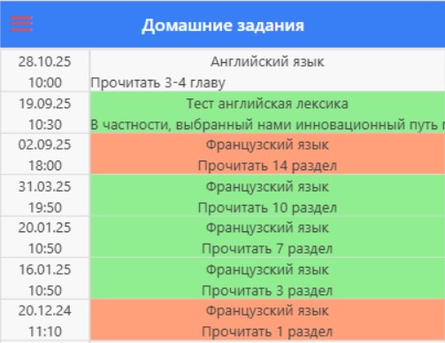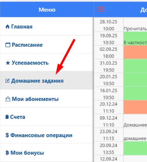 Перед вами список домашних заданий ученика (он подтягивается из занятий ученика, где было указано домашнее задание). Поле ДЗ заполняет преподаватель через приложение или администратор СРМ.